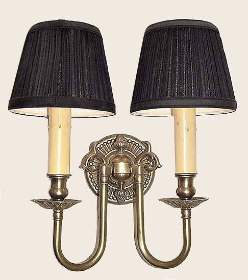 A slight variation of MODEL NS101, this one is shown in Satin Brass with a different backplate, it continues that country look. Colonial in style and delicate enough for placement in many settings. Note the different candle cups. Looks great in other metals like polished brass, nickel and even our bronze!