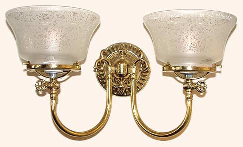 An interior designer favorite, this period accurate Victorian two light two arm gas light wall sconce. Complete with etched glass shade and faux gas keys for realism, it is well suited for the discerning tastes and placeable in many locations..