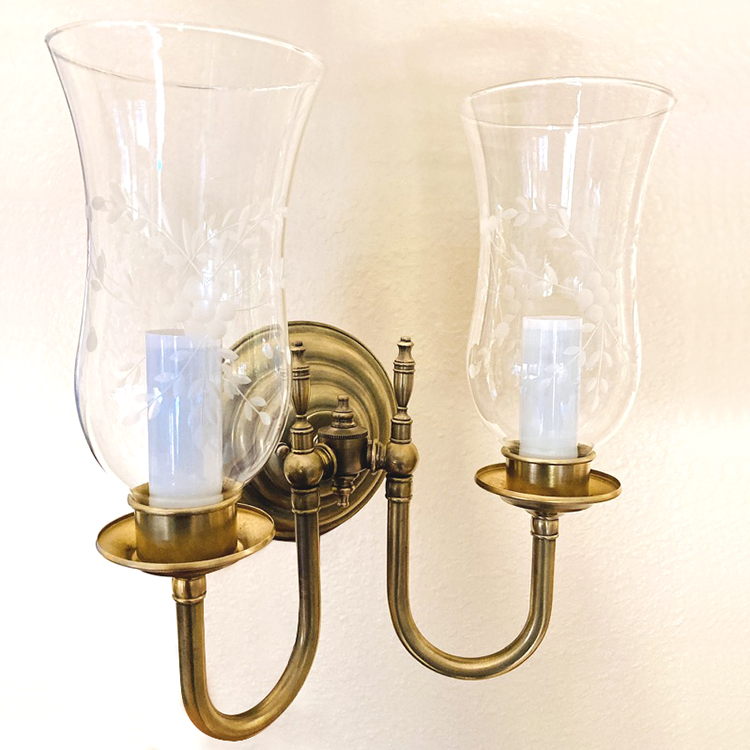 Many of these double Colonial hurricane wall sconces live in many different parts of the world. This very detailed beauty is in a class all its own! The grape cut, hurricane shades, add so much flavor. Overall, this two light 'U' arm captures the heart and spirit of Country Colonial. Very tailored!
