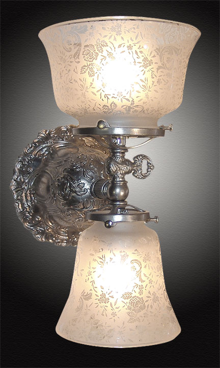 This French Gaslight is shown in Hand Styled Antique Pewter. Works best in pairs. Place it on either side of your vanity mirror or fireplace, or even beside your bed. An excellent foyer, closet or library light as well. Notice the stunning detail of all the solid cast brass parts. The addition of the faux gas key adds realism here.